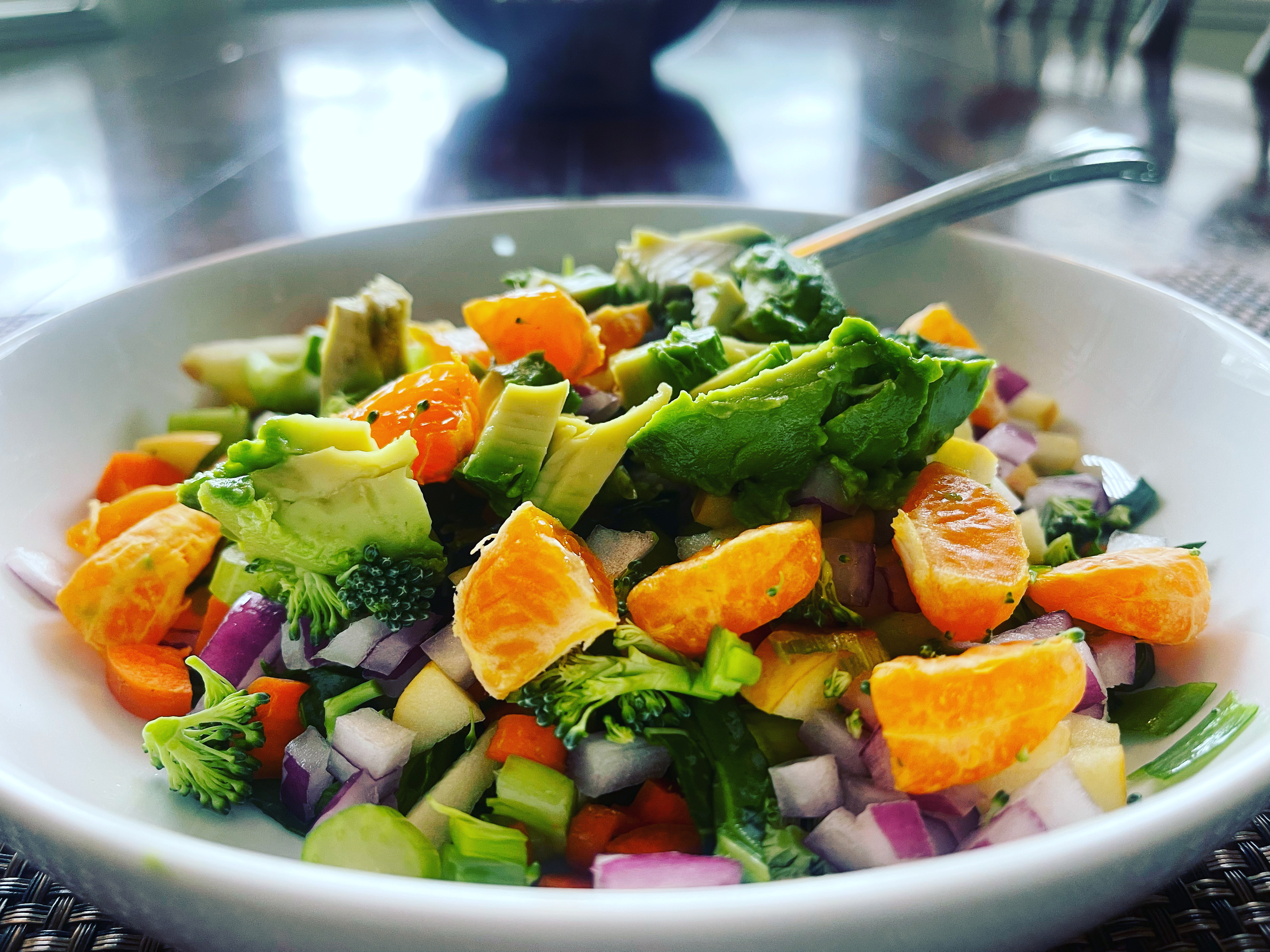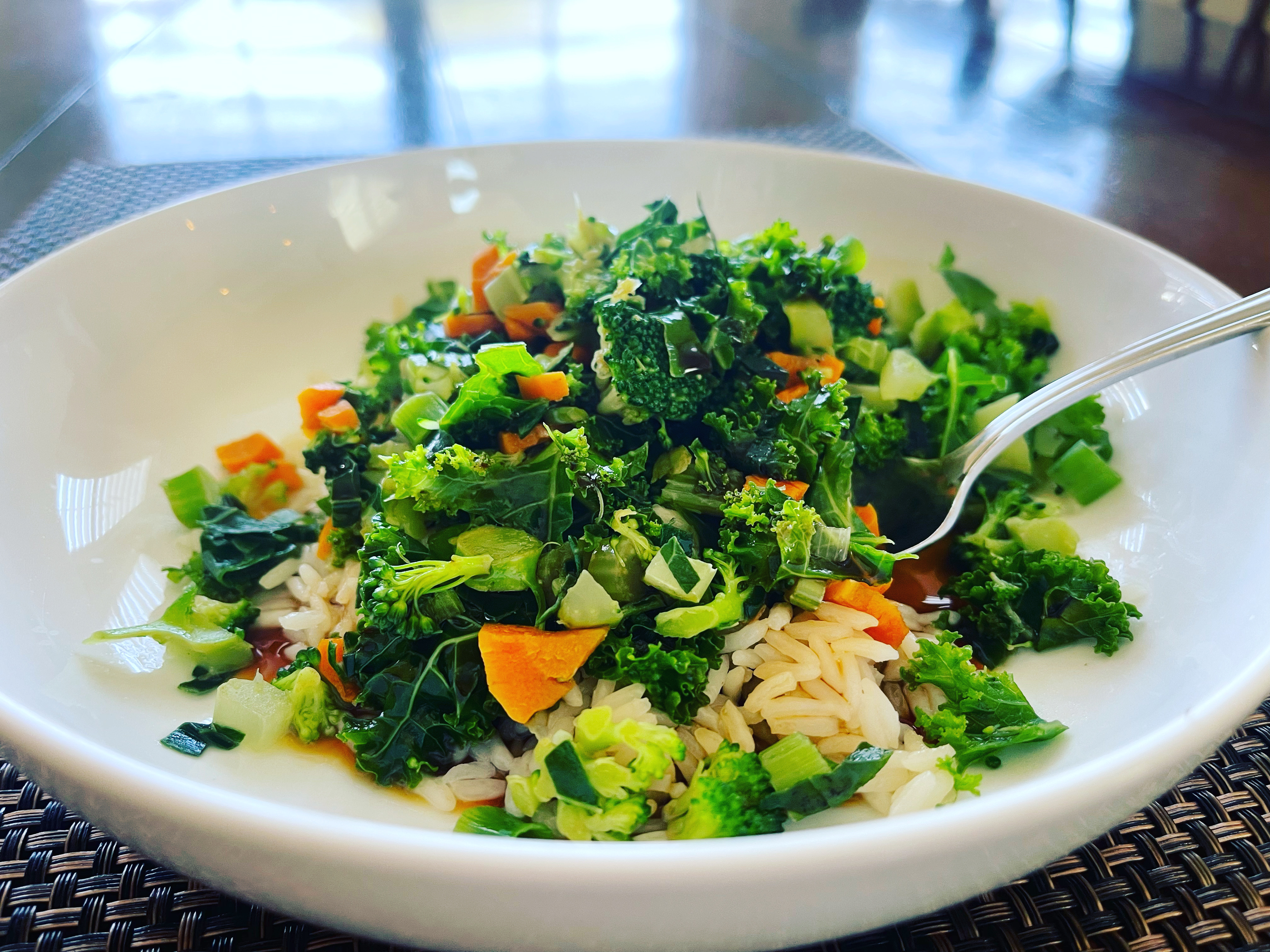 A ready-to-go base salad mix is essential for living a no "added" sugar lifestyle. My go-to mix is made of kale, broccoli, collard green, celery and carrot. The vibrant mix of greens serves as an excellent base to any salad bowl and can be sprinkled on top of any plate. It can also be stirred into simmering soups and makes an excellent stir-fry (as shown). The mix will keep up to a full week if washed, chopped and stored correctly.